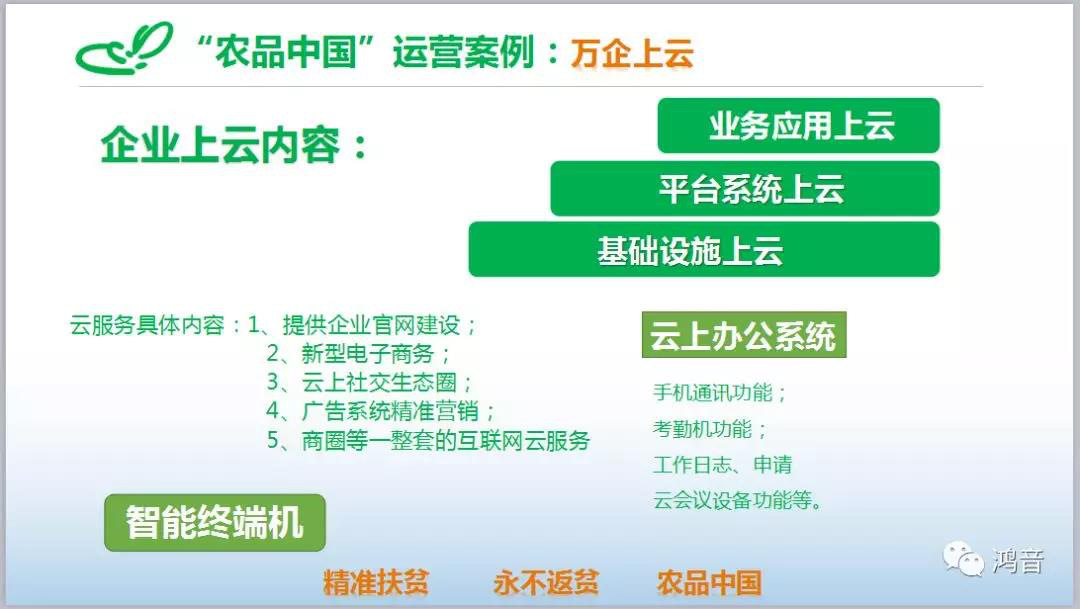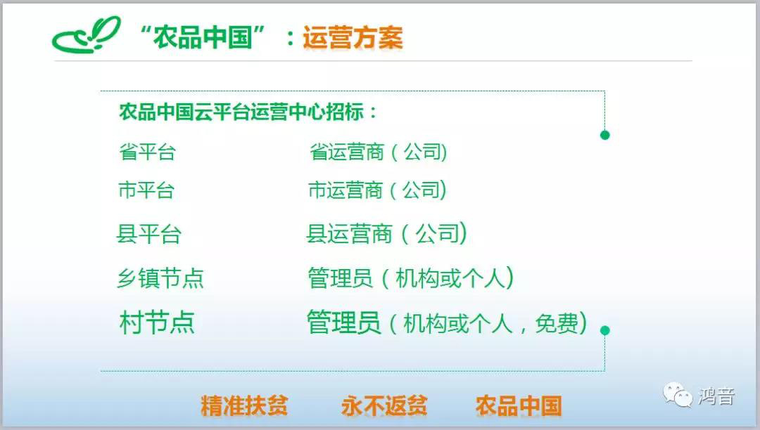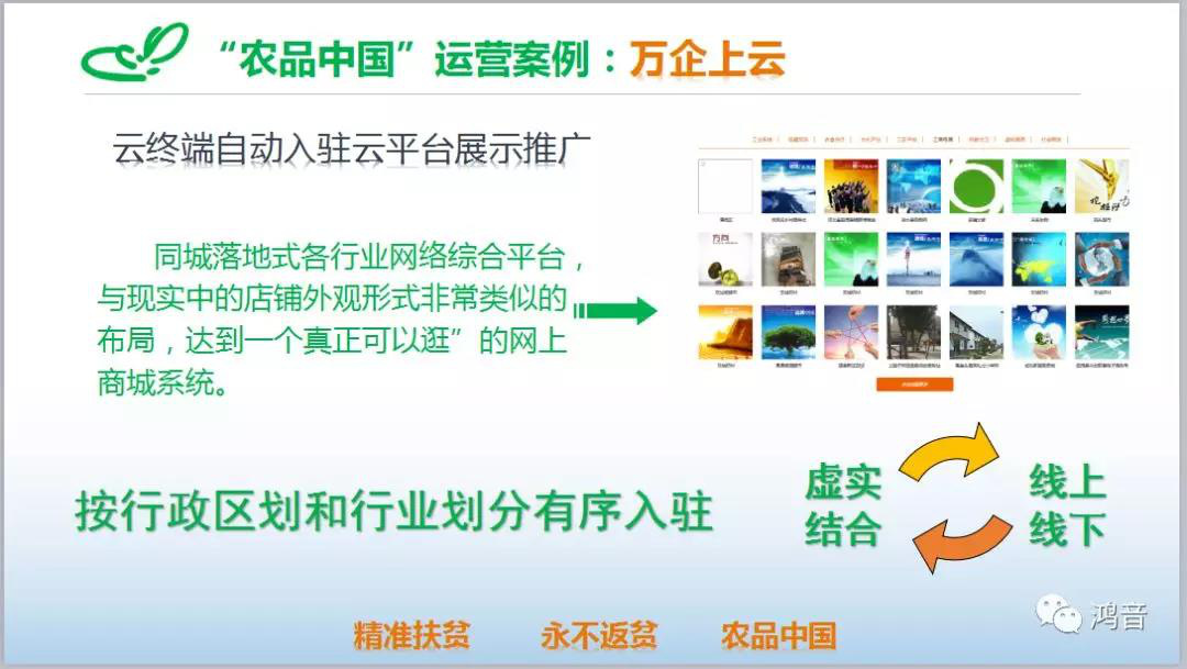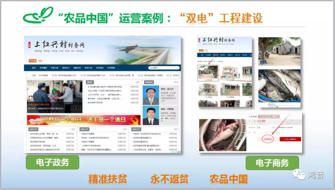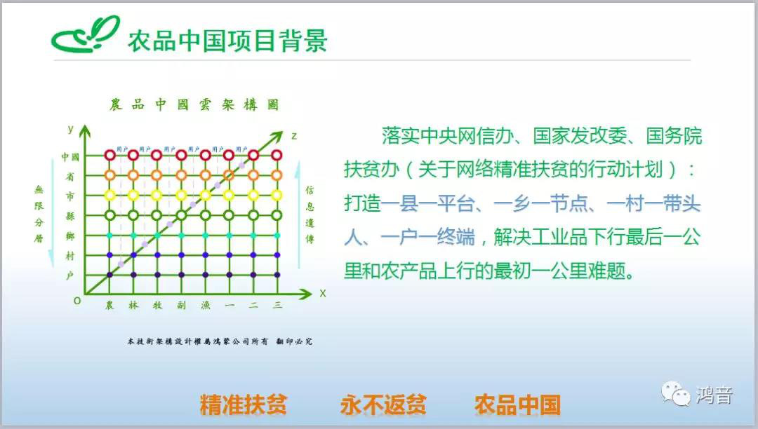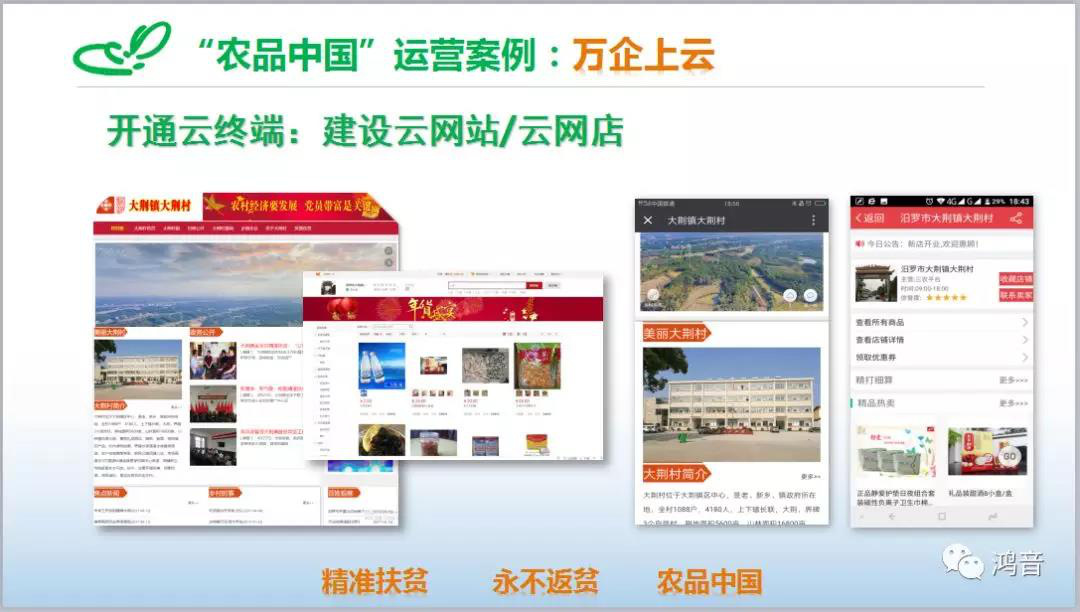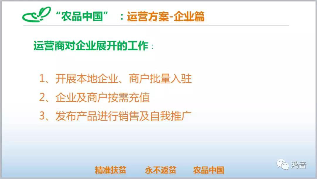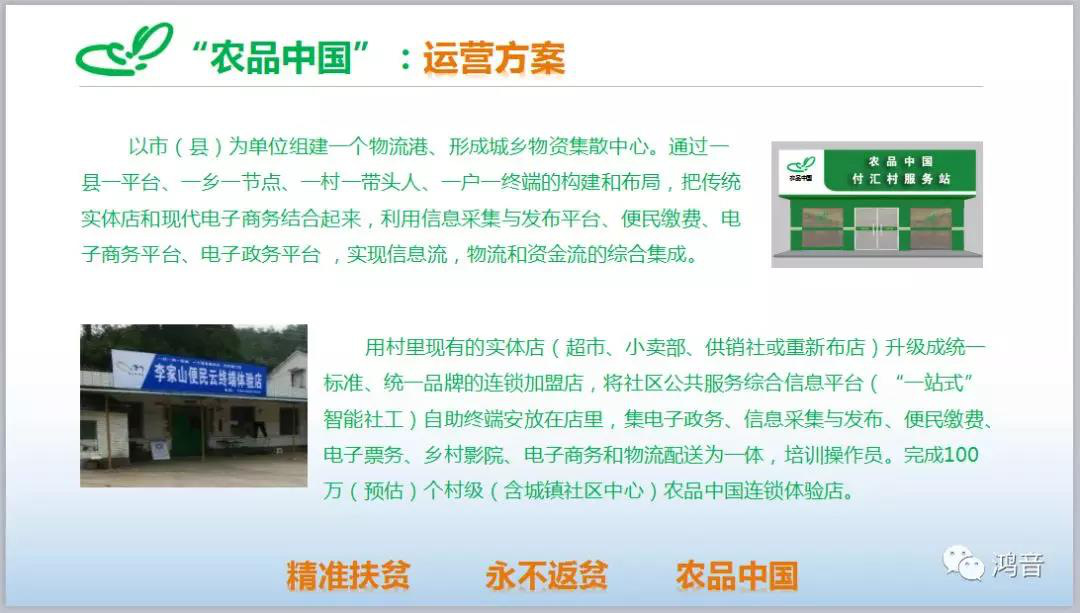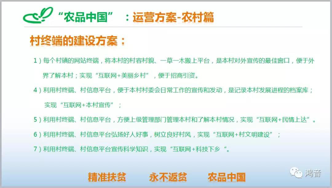 落实国家网信办、扶贫办、发改委《关于网络精准扶贫的行动计划》,打造一县一平台,一乡一节点,一村一带头人,一户一终端,解决工业品下行最后一公里和农产品上行的最初一公里难题。