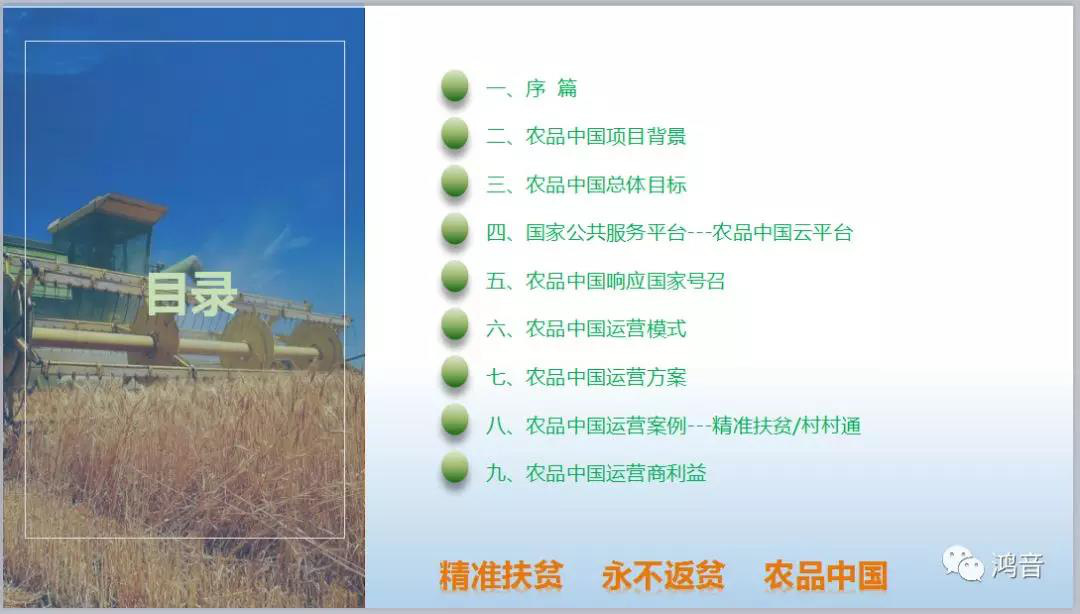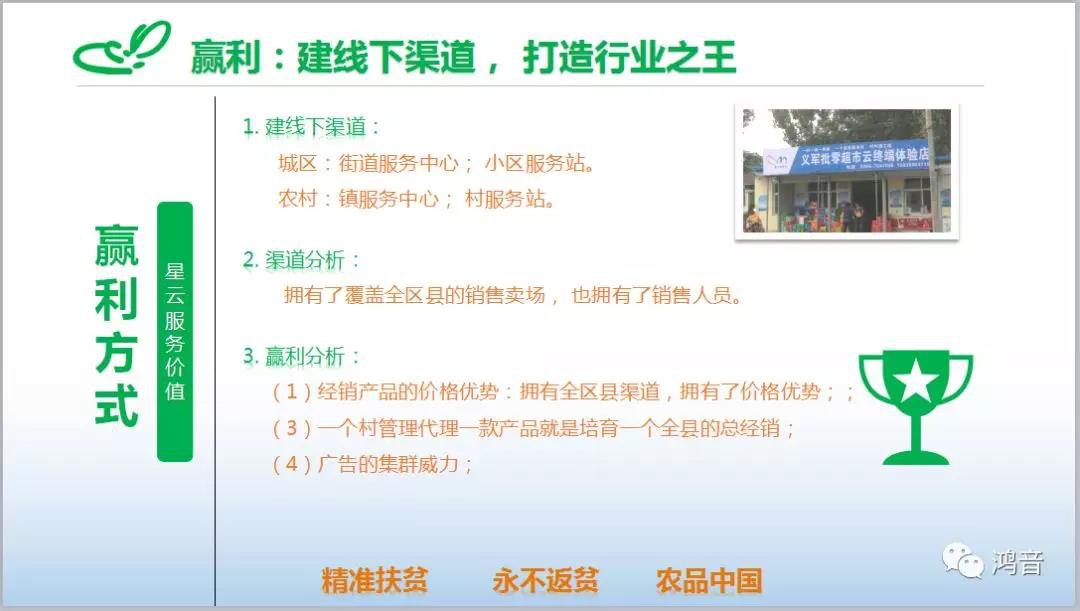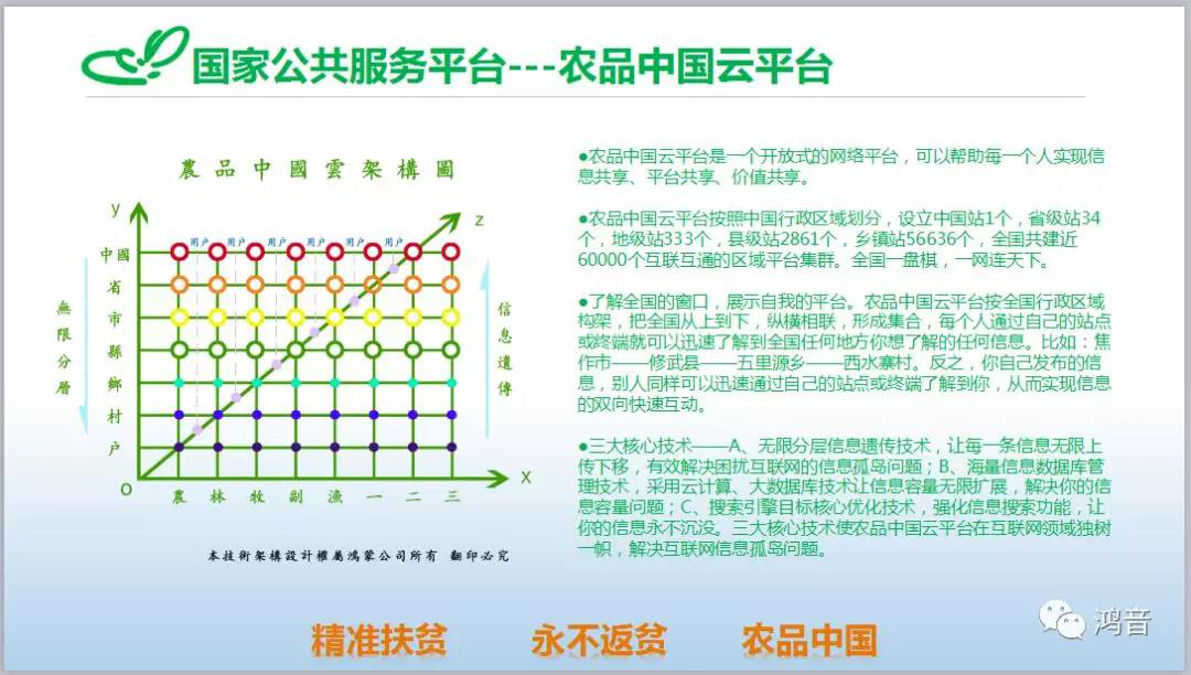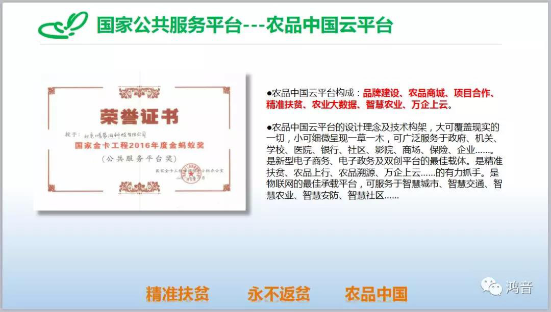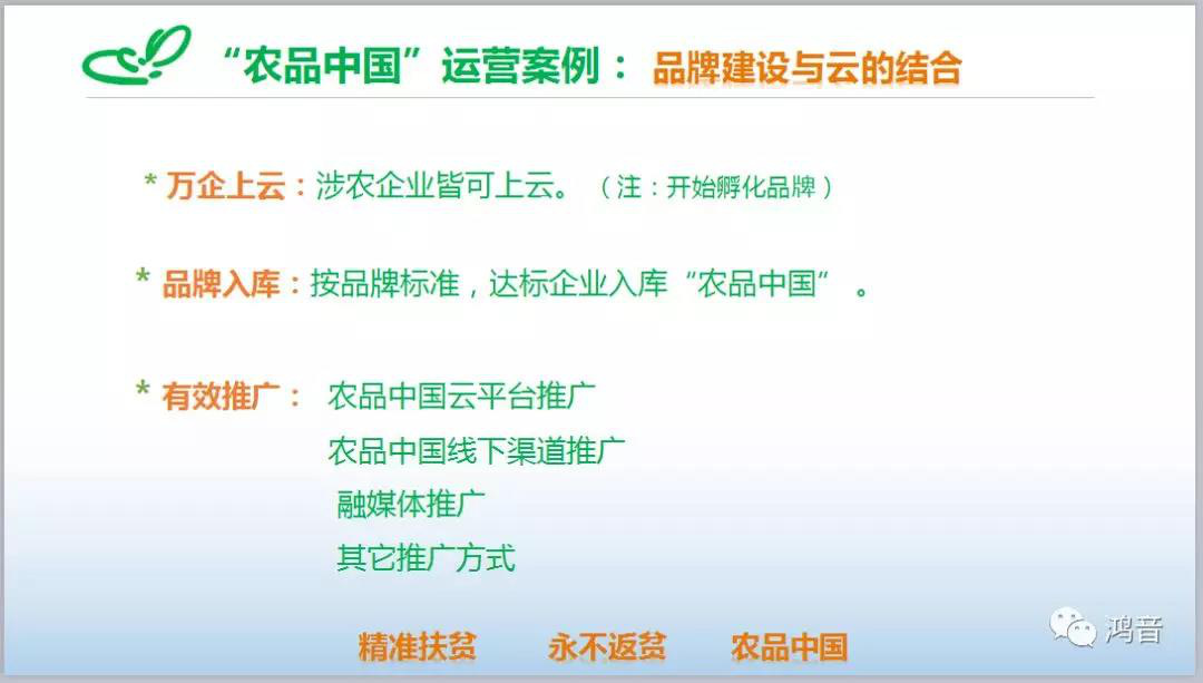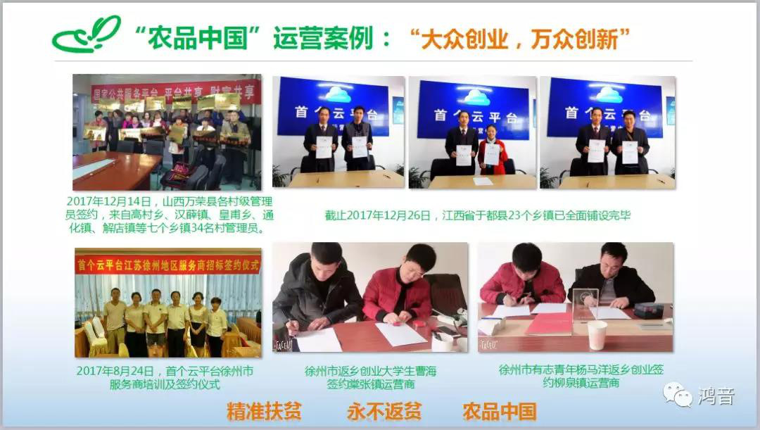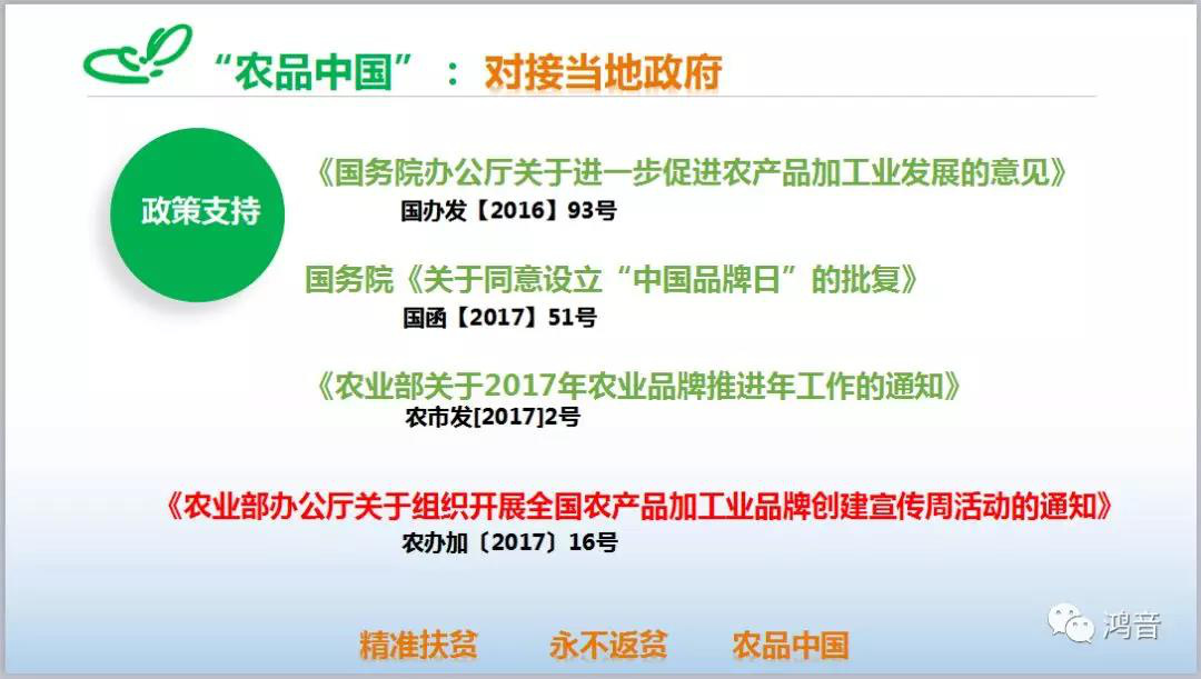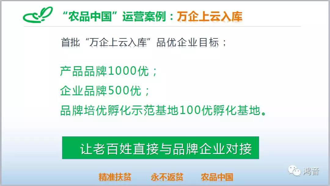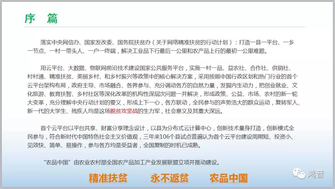 落实国家网信办、扶贫办、发改委《关于网络精准扶贫的行动计划》,打造一县一平台,一乡一节点,一村一带头人,一户一终端,解决工业品下行最后一公里和农产品上行的最初一公里难题。